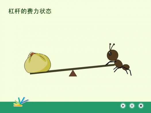 以生动的动画形式,贴切的小例子,使我们看到当小蚂蚁把支点的位置移到杠杆的2\/3处时(向自己的方向移动),小蚂蚁更费力了。因此我们明白了使杠杆的动力臂变短,就会费力。