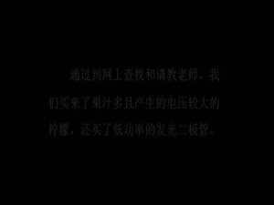 《神奇的水果电池》DV作品真实记录了作者探索水果电池奥秘、制作果汁LED灯的过程。\n物理课上老师说用水果能做成电池,引起了同学们兴趣,我们决定去探个究竟。做这个探索实验的过程中,我们发现插入铜片和锌片的水果能产生电压。经过进一步实验发现它不能点亮小灯泡。后来我们组装成了水果电池组,得到了较高电压,终于点亮了发光二极管。最后我们进行了果汁灯的创作,经过失败与改进,最后我们做成了两个作品,发光的花朵和亮蝴蝶。