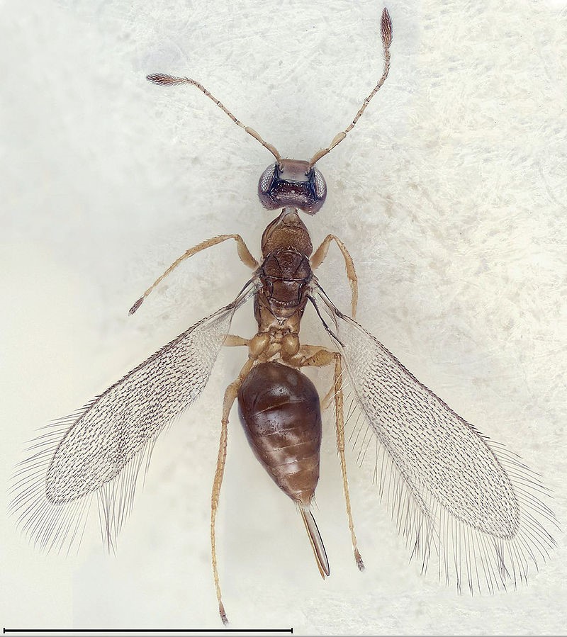0.25毫米到底是多小呢?打个比方,柄翅卵蜂的体型只有蚂蚁的1/400,头发丝直径的2~3倍大。所以,要想靠肉眼找到柄翅卵蜂也不是一件容易的是,可以说是大海捞针啊。那么,昆虫学家们又是怎样找到柄翅卵蜂的呢?