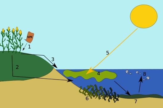自然和人为因素都有可能导致富营养化。比如人类的农业和工业活动向自然界释放废料,这些废料中常常含有磷和氮化合物,这些成分对于植物来说是非常重要的养分,尤其是对于那些单细胞植物,比如藻类。