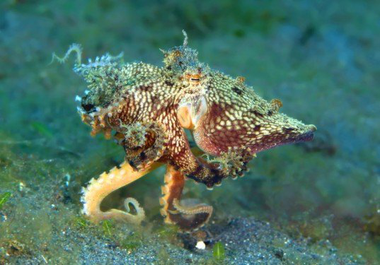 你们一定经常见到我们用8只触手匍匐前进或者用自带的“喷射器”推动前进。但我们偶尔也会像你们一样用两条“腿”走路,所谓的“腿”其实也是触手。有时候还会在身体下面夹带个椰子壳或者贝壳。这在你们看来或许很滑稽,但是对于我们的猎物,或者以我们为猎物的捕食者来说,可就是很好的伪装了。配合上水流的速度,“行走”的我们看起来就像一团随波逐流的海藻。