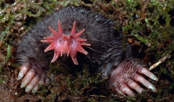星鼻鼹(Condylura cristata)是世界上最奇特的动物之一。它们最特别的地方就在于鼻子上有一圈星芒结构,由22根肉嘟嘟的触手环绕鼻尖而成,每根触手的长度在1~4毫米不等。星鼻鼹的体长在20厘米左右,和其他鼹鼠一样,它们有着前突的吻、圆筒形的身材、强壮的前肢、宽大的脚掌和爪子。它们的毛发短而密,但比其他鼹鼠要粗糙。背部的毛色呈现为棕黑或黑色,腹部则为浅棕色。到了冬天,它们的尾巴直径会膨胀到平时的3~4倍。