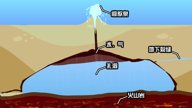 “仅有热源和水还是不够的,间歇泉形成条件中还有一个关键环节,就是地下裂缝组成的管道系统。你们来看。”爸爸指着画好的图,“在水流的作用下,岩层会出现大小不一的孔洞,这些孔洞可以看成储水的容器,地下的高温蒸汽和加热的水柱,会沿岩层内部管道进入孔洞中,当孔洞被填满,水、气就会在巨大的压力下,猛然喷出洞腔形成喷泉。喷射完毕后,地表冷水再次进入地下管道,当孔洞再次被填满,间歇泉就会再次喷发。周而复始循环往复。”