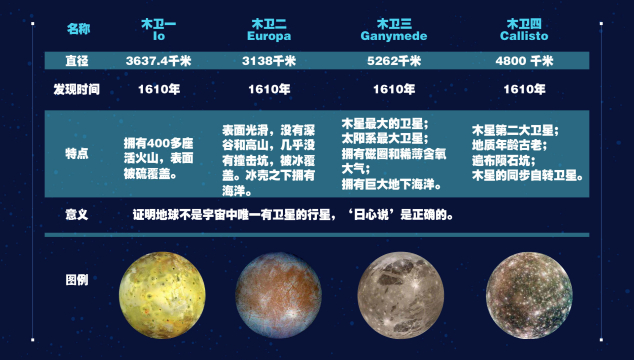 木卫一拥有众多火山,是太阳系中火山最活跃的星球;木卫二表面被冰覆盖,其冰下海洋成为科学家寻找地外生命的目标之一;木卫三是木星最大的卫星,也是太阳系中最大的卫星,拥有磁圈及稀薄含氧大气;木卫四地质年龄古老且遍布陨石坑,是木星的同步自转卫星。