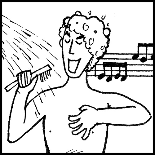 因为浴室是一个相对狭小的空间,所以混响度会相对较高。另外,如果你在一个山洞里,回声会从山洞的墙壁上传来,而这些墙壁通常都很远。可是淋浴房的墙壁都很近,所以你会同时听到很多回声。更大的音量代表了更有力的声音,这就是为什么马丁的歌声会变得更洪亮。