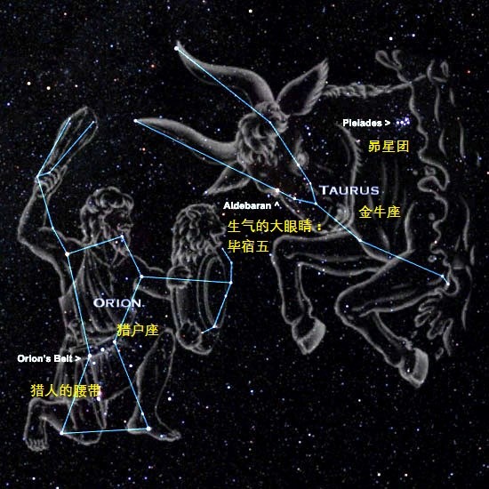 找到猎户座里猎人的腰带,朝着天狼星相反的方向延长,看到的那颗橙色的亮星就是金牛的眼睛了!
