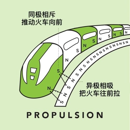 “小朋友,你真爱思考。”工作人员摸摸小刚的头,说,“磁悬浮列车是没有发动机的,它能这么快地运行,是应用了磁铁的吸引力和排斥力。想象一下,每节列车都是一个装有四块磁铁的盒子,每个角落一个。第一个盒子的N极被前面轨道的S极吸引,列车被向前拉;同时,又被后面的N极排斥,列车就会被往前推。轨道上的电磁铁会在列车前进时不断变化磁极,循环交替,列车就能不断向前运行啦。”