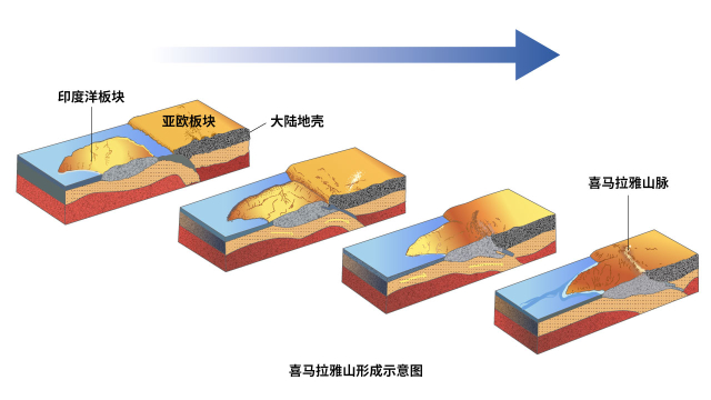 “是的。你们看,喜马拉雅山脉,也就是珠穆朗玛峰是位于亚欧板块和印度洋板块交界处。”妈妈又翻到了另外一张图,继续解释道,“在很久很久以前,它们彼此是分开的。但是由于板块运动,印度洋板块向北俯冲,最终撞上了亚欧板块。两个板块之间发生了碰撞、挤压,于是就形成了现在的喜马拉雅山脉。”