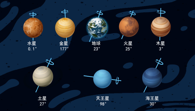 其中土星密度最小仅有0.7,低于水密度;水星的公转速度最快,每秒48公里;木星的自转速度最快,自转一圈只需要9小时50分。金星的自转比公转用时还长,且与其他行星自转方向相反。除金星外,天王星自转轴和公转轨道夹角将近98°,可谓躺着自转。