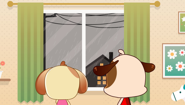 “没错,雨停了!陪你跳水坑去。”开开拉着心心出门玩了。
