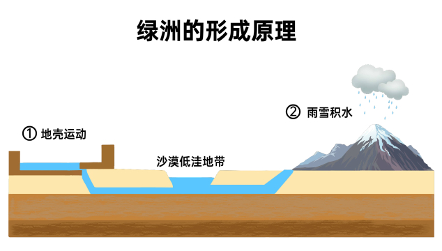 沙漠中的绿洲多在沙漠低洼地带,由地下水渗出形成。绿洲的形成大体分为两种,茫茫无际的沙海下面的岩层中拥有充足的地下水,因地壳运动导致岩层断裂,地下水就沿着裂缝流至低洼的沙漠地带冲出地面形成绿洲,如撒哈拉沙漠中大多数绿洲。还有一种是由于高山上的冰雪融化,顺着山坡流淌形成河流。河水流经沙漠,便渗入沙子里变成地下水。而无法越过山脉的云雨降水深入底下,与地下水汇合,沿着不透水的岩层流至沙漠低洼地带后,涌出地面形成绿洲,如塔克拉玛干沙漠。