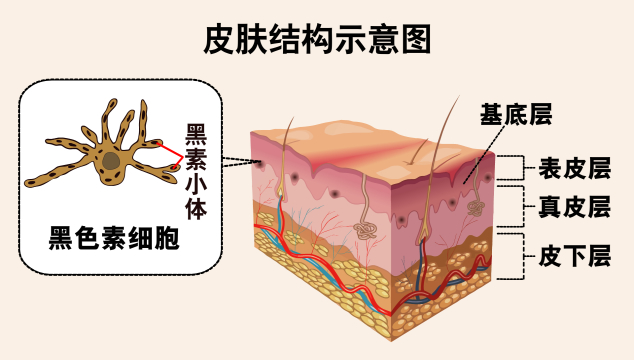 人体的皮肤有三层:表皮层、真皮层和皮下层,构成表皮层的主要细胞叫做角质形成细胞,除此之外,在表皮层的基底层还有一种细胞叫做黑色素细胞。在黑色素细胞中存在椭圆形的黑素小体,而黑素小体内发生化学反应产生的黑色素最终决定了人体的肤色深浅度。