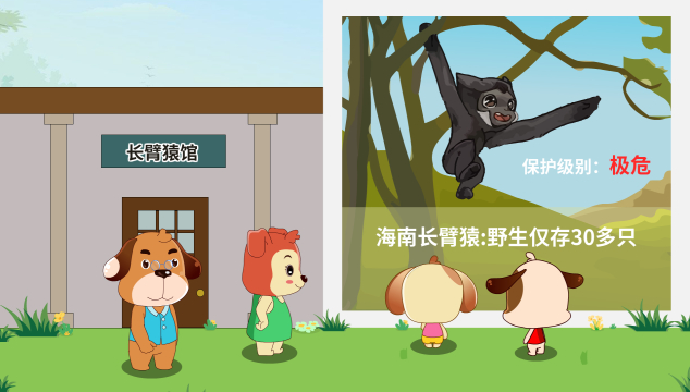 开心一家周末去动物园玩,正好赶上园内进行濒危动物保护的宣传活动。这次宣传活动的主角是我国独有的长臂猿品种——海南长臂猿:海南长臂猿,现在野生仅存30多只,种群数量极为稀少,一度处于濒临野外灭绝的处境,仅分布于我国海南省,属于我国特有物种,为国家一级保护动物,保护级别:极危。