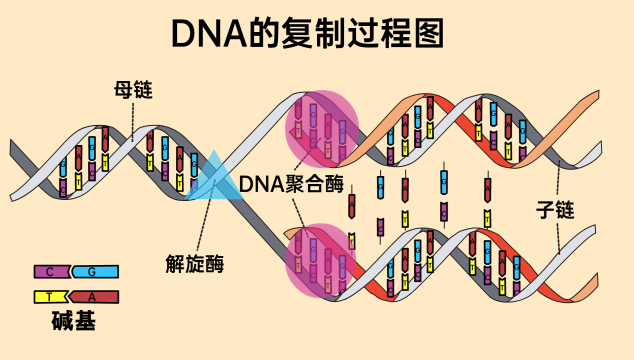 “然后就以母链作为模板进行复制。而复制的材料就来源于游离的脱氧核苷酸中的四种碱基,也就是我们刚才说的A、T、C、G。”妈妈继续讲解道,“解旋需要解旋酶,那合成也同样需要酶的帮忙,这种酶叫做DNA聚合酶。在这种酶的作用下,遵循碱基互补配对原则,为母链复制出对应的子链,这便是DNA的复制过程。在整个复制过程中,因原DNA的两条链中有一条链被保留下来,所以科学家称这种复制为半保留复制。”