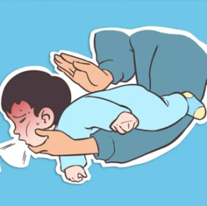 施救者可以单腿跪地,或取坐位,让孩子趴在大腿上,头低臀高,连续用力拍击背部(两肩胛骨之间)5次,如未排出,继续反复拍背。也在椅子上,也可下蹲或单腿跪在地上,用一手两三指放在患儿肚脐上方一两横指的地方,另一手的两三指重叠在上,连续向患儿的后上方冲击。如果患儿意识丧失,应立即将其身体平放在地,骑跨在患儿身体上方,一手手掌根部在肚脐上方一两横指处冲击5次,若未排出异物,继续冲击5次,如此反复。