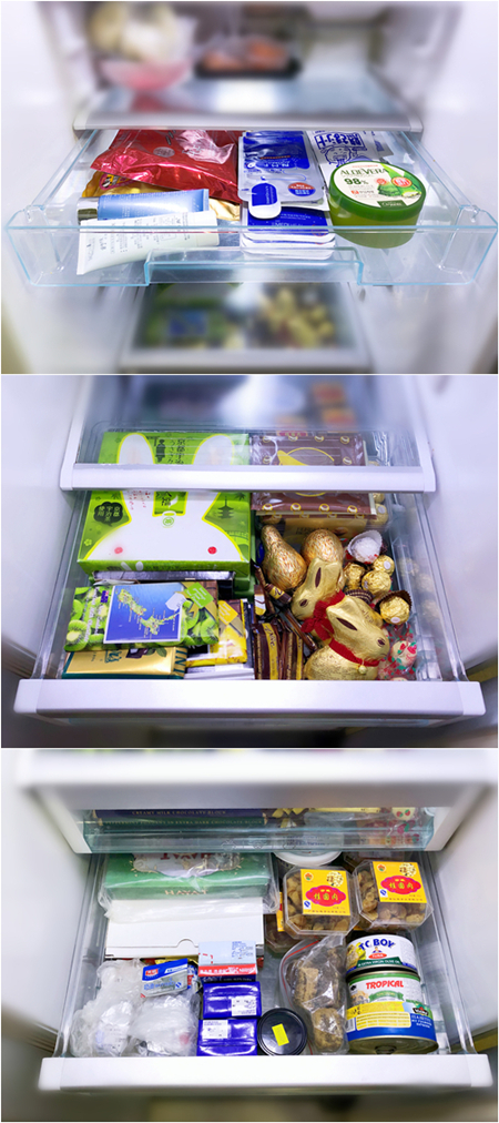 储藏抽屉的好处是材质透明、整齐划一,里面存放的东西一目了然,一些形状不规则的瓶瓶罐罐和零七八碎的小东西,都很适合放进去。四个储藏抽屉里面的前三个,我依次放了化妆品(面膜等)、需要冷藏的零食(巧克力、糖果)以及烘焙用品(比如小的盒装奶油)和各种干货。这部分区域,建议大家根据自己的实际需要、喜好、习惯来收纳。