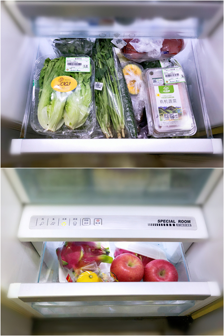 剩下的两个冷藏抽屉,我依次放置了蔬菜和水果。蔬菜特别是绿叶菜,建议用保鲜膜或密封袋包好再储藏,或者也可以直接用超市打好的包装,合理的储藏方法会延长蔬菜的“寿命”。如果是准备除夕家宴,很多菜其实可以预处理,比如需要切块的、切条的、切丝儿的,一份菜所需的各种食材可以先加工好,再混合在一起放进保鲜袋中,这样除夕当天只需要从冰箱拿出直接烹制就可以了。