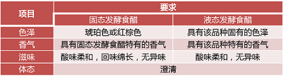 该标准将酿造食醋根据发酵工艺的不同分为了两类——固态发酵食醋和液态发酵食醋。对于固态发酵和液态发酵食醋的感官要求和理化指标也稍有差别。