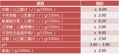 可以看出,山西老陈醋的感官标准比上述两个标准的要求要高很多。理化指标中对风味物质的种类和含量要求也更高,可溶性无盐固形物要求不少于9g/100mL,还分别对氨基酸、还原糖、总酯等物质含量有具体要求,对pH值和含盐量也有相应规定。