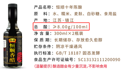 其次,看总酸含量。根据标准要求,这也是包装上必备的要素。总酸含量高的醋口味也更酸。除甜醋以外,其他食醋总酸都要求都在3.5g/100mL以上,含量高的可达6g/100mL,甚至高达8g/100mL。