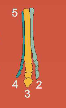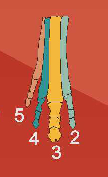 始祖马:前脚有4趾,后脚有3趾,全部接触地面。